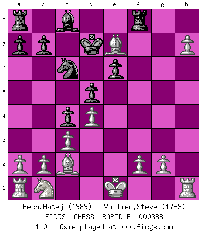 Last move : 1-0 2023 July 16 11:58:14 [Event "FICGS__CHESS__RAPID_B__000388"] [Site "FICGS"] [Date "2023.04.20"] [Round "1"] [White "Pech,Matej"] [Black "Vollmer,Steve"] [Result "1-0"] [WhiteElo "1989"] [BlackElo "1753"] 1.e4 e6 2.d4 d5 3.e5 c5 4.c3 Ne7 5.Nf3 Nbc6 6.Bd3 Ng6 7.h4 c4 8.Bc2 Be7 9.h5 Nh4 10.Nxh4 Bxh4 11.Qg4 Be7 12.Qxg7 Rf8 13.Bxh7 f6 14.exf6 Rxf6 15.h6 Rf8 16.Bc2 Kd7 17.h7 Rh8 18.Bg5 Qf8 19.Qxf8 Rxf8 20.Bxe7 1-0 Follow this game move after move (download)Chess, like love, like music, has the power to make people happy. (Siegbert Tarrasch) Schach ist eine Sache der genauen Beurteilung, wann man zuschlagen und wann man sich ducken muss. (Robert James Fischer) Fischer no está bajo la obligación de nadie. (Joseph Platz) Les échecs, c'est la lutte contre l'erreur. (Johannes Zukertort) If you are good, you will be assigned all the work. If you are really good, you will get out of it. (Dan Rotaru)