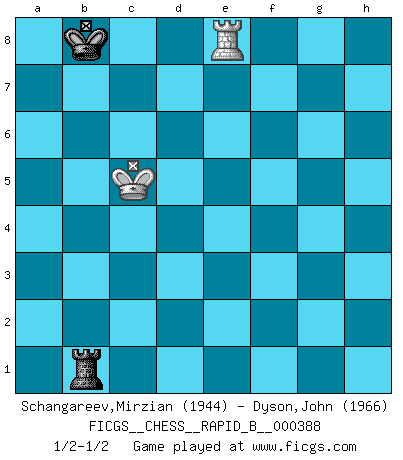 Last move : 1/2-1/2 2023 June 15 14:45:38 [Event "FICGS__CHESS__RAPID_B__000388"] [Site "FICGS"] [Date "2023.04.20"] [Round "1"] [White "Schangareev,Mirzian"] [Black "Dyson,John"] [Result "1/2-1/2"] [WhiteElo "1944"] [BlackElo "1966"] 1.e4 e5 2.Nf3 Nc6 3.Bb5 Nf6 4.O-O Nxe4 5.Re1 Nd6 6.Nxe5 Be7 7.Bf1 Nxe5 8.Rxe5 O-O 9.d4 Bf6 10.Re1 Nf5 11.c3 c6 12.Bf4 d5 13.Bd3 Bg5 14.Qg4 Bxf4 15.Qxf4 Qd6 16.Qxd6 Nxd6 17.Nd2 a5 18.a4 Bf5 19.Bxf5 Nxf5 20.h3 f6 21.g4 Nd6 22.Re7 Rfe8 23.Rd7 Rad8 24.Rxd8 Rxd8 25.b4 axb4 26.cxb4 Kf7 27.a5 Rb8 28.f3 Kg6 29.Nb3 Nb5 30.Kf1 h5 31.Kf2 f5 32.gxh5+ Kxh5 33.Rg1 g6 34.Nc5 Nxd4 35.Rd1 Nc2 36.Rd2 Nxb4 37.Rb2 Ra8 38.Rxb4 Rxa5 39.Nd3 b5 40.Rb2 g5 41.Rc2 Kh4 42.f4 Ra6 43.fxg5 Kxg5 44.Ke3 b4 45.Rg2+ Kf6 46.Nxb4 Ra3+ 47.Kd4 Ra4 48.Kc5 f4 49.Nxc6 Ra3 50.Kxd5 Rxh3 51.Nd4 Rh5+ 52.Ke4 Rh4 53.Nf3 Rh8 54.Ra2 Ke6 55.Ra6+ Ke7 56.Kxf4 Kd7 57.Ne5+ Kc7 58.Kf5 Kb7 59.Rf6 Ka7 60.Ke4 Kb7 61.Kd5 Kc7 62.Kc5 Kb7 63.Kb5 Kc7 64.Rc6+ Kb7 65.Ka5 Rc8 66.Re6 Ka7 67.Re7+ Ka8 68.Ka6 Rc6+ 69.Kb5 Rd6 70.Nc6 Rd7 71.Re1 Kb7 72.Kc5 Rc7 73.Re8 Rxc6+ 74.Kd5 Rb6 75.Re7+ Kb8 76.Kc5 Rb1 77.Re8+ 1/2-1/2 Follow this game move after move (download)Chess is as much a mystery as women. (Purdy) Deine Wertungszahl - vorausgesetzt einige Jahre schachliche Anstrengung - entspricht etwa dem zehnfachen Deines IQ plus 1000. (Jonathan Levitt) Por tratar de evitar la pérdida de una pieza, muchas personas han perdido una partida de Ajedrez. (Savielly Tartakover) Pour moi, les échecs ne sont pas un jeu mais un art. (Alexandre Alekhine) The difference between perseverance and obstinacy is that one comes from a strong will, and the other from a strong won't. (Henry Ward Beecher)