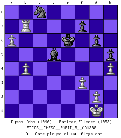 Last move : 1-0 2023 June 9 1:56:36 [Event "FICGS__CHESS__RAPID_B__000388"] [Site "FICGS"] [Date "2023.04.20"] [Round "1"] [White "Dyson,John"] [Black "Ramirez,Eliecer"] [Result "1-0"] [WhiteElo "1966"] [BlackElo "1953"] 1.e4 c5 2.Nc3 g6 3.d4 cxd4 4.Qxd4 Nf6 5.Nf3 Nc6 6.Qa4 d6 7.e5 dxe5 8.Nxe5 Bg7 9.Bb5 O-O 10.Nxc6 bxc6 11.Bxc6 Rb8 12.O-O Qc7 13.h3 Rd8 14.Re1 e5 15.Be3 Bf5 16.Bb5 Bxc2 17.Qxa7 Nd5 18.Rac1 Qxa7 19.Bxa7 Nxc3 20.Bxb8 Nxb5 21.Bxe5 Bxe5 22.Rxe5 Nd4 23.Kh1 Kg7 24.Rc5 Ba4 25.R5c4 Bb5 26.Rc8 Rd6 27.Rd1 Kf6 28.Ra8 h5 29.a4 Be2 30.Rd2 Bc4 31.Re8 Be6 32.b4 Bb3 33.a5 Bc4 34.f3 Ba6 35.h4 Bc4 36.Re4 Nf5 37.Rxd6+ Nxd6 38.Re1 Kf5 39.Re7 Kf6 40.Ra7 Ke6 41.a6 Bd5 42.Kg1 Nc8 43.Rb7 1-0 Follow this game move after move (download)Chess is a more highly symbolic game, but the aggressions are therefore even more frankly represented in the play. It probably began as a war game; that is, the representation of a miniature battle between the forces of two kingdoms. (Karl Meninger) Bis zum Jahr 1971 verlief in meiner Schachkariere alles glatt. Dieses dramatische Match [Fischer-Taimanov 6:0] machte mein Leben zur Hölle. (Mark Taimanov) Fischer era un maestro de claridad y un Rey del posicionamiento astuto. Sus oponentes podían ver hacia donde se dirigía pero eran impotentes para detenerlo. (Bruce Pandolfini) On croit qu'il y a plus de mauvais joueurs que de bons joueurs, c'est faux : Il y a autant de joueurs qui gagnent que de joueurs qui perdent. (Philippe Geluck) The right perception of any matter and a misunderstanding of the same matter do not wholly exclude each other. (Kafka's the trial)