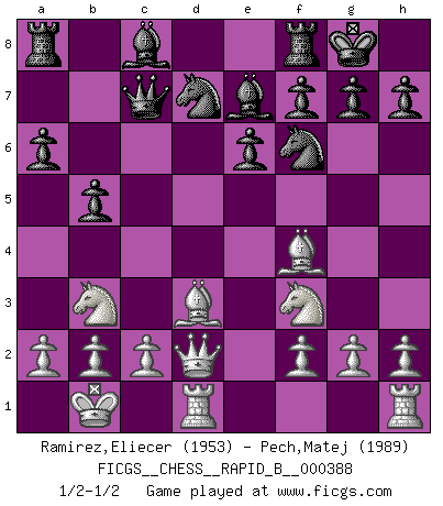 Last move : 1/2-1/2 2023 June 27 12:16:57 [Event "FICGS__CHESS__RAPID_B__000388"] [Site "FICGS"] [Date "2023.04.20"] [Round "1"] [White "Ramirez,Eliecer"] [Black "Pech,Matej"] [Result "1/2-1/2"] [WhiteElo "1953"] [BlackElo "1989"] 1.e4 e6 2.d4 d5 3.Nd2 c5 4.exd5 Qxd5 5.dxc5 Bxc5 6.Ngf3 Nf6 7.Bc4 Qc6 8.Qe2 O-O 9.Nb3 Bd6 10.Bg5 Nbd7 11.O-O-O Qc7 12.Kb1 a6 13.Qd2 Be7 14.Bd3 b5 15.Bf4 Qb6 16.Be3 Qc7 17.Bf4 Qb6 18.Be3 Qc7 19.Bf4 1/2-1/2 Follow this game move after move (download)My style is somewhere between that of Tal and Petrosian. (Reshevsky) Charakterschwächen offenbaren sich normalerweise während einer Schachpartie. (Garry Kasparov) Cuando tu casa esta en llamas, no puedes ser molestado por tus vecinos. O, como decinos en Ajedrez, si tu Rey esta bajo ataque, no te preocupa perder un Peón del lado de la Reina. (Gary Kasparov) Mon pion favori sur ma case favorite ! Bronstein en parlant d'un coup de pion en h5 quand il avait les Noirs. Information on the Internet is subject to the same rules and regulations as conversation at a bar. (George Lundberg)