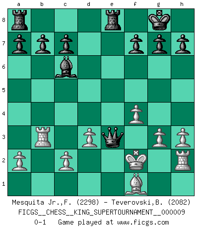 Last move : 0-1 2023 April 29 21:43:58 [Event "FICGS__CHESS__KING_SUPERTOURNAMENT__000009"] [Site "FICGS"] [Date "2023.04.23"] [Round "1"] [White "Mesquita Jr.,Fausto Monteiro"] [Black "Teverovski,Bogoljub"] [Result "0-1"] [WhiteElo "2298"] [BlackElo "2082"] 1.e4 e5 2.f4 d5 3.exd5 e4 4.Nc3 Nf6 5.d3 Bb4 6.Bd2 e3 7.Bxe3 O-O 8.Nf3 Nxd5 9.Bd2 Bxc3 10.bxc3 Qf6 11.g3 Nxc3 12.Bxc3 Qxc3+ 13.Nd2 Bg4 14.Qc1 Nc6 15.h3 Bf3 16.Rh2 Nd4 17.Rb1 Rfe8+ 18.Kf2 Bc6 19.Nb3 Nxb3 20.Rxb3 Qd4+ 21.Qe3 Qxe3+ 0-1 Bogoljub Teverovski Just played a good game in Falkbeer Follow this game move after move (download)It is not enough to be a good player... you must also play well. (Siegbert Tarrasch) Sehr viele beherrschen heutzutage das große Einmalseins des Schachspiels und kennen sogar dessen Logarithmentafeln auswendig - deshalb sollte man hin und wieder zu beweisen trachten, dass zwei mal zwei auch fünf sein kann. (Mikhail Nekhemyevich Tal) Coloca el contenido del tablero de Ajedrez en un sombrero, agita las piezas vigorosamente, derrámalas en el tablero desde una altura de medio metro y así obtienes el estilo de Wilhelm Steinitz. (H. E. Bird) D'abord les bases : Jouez et étudiez, puis étudiez et jouez, ensuite jouez et étudiez, puis étudiez et jouez. Deuxièmement : Donnez toujours le meilleur de vous-même ! (Ken Smith) After growing wildly for years, the field of computing appears to be reaching its infancy. (John Pierce)
