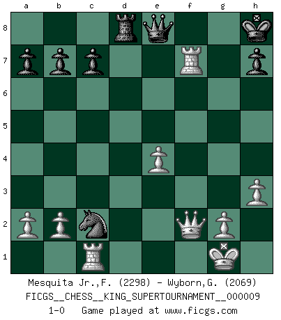 Last move : 1-0 2023 June 17 14:45:1 [Event "FICGS__CHESS__KING_SUPERTOURNAMENT__000009"] [Site "FICGS"] [Date "2023.04.23"] [Round "1"] [White "Mesquita Jr.,Fausto Monteiro"] [Black "Wyborn,Graham"] [Result "1-0"] [WhiteElo "2298"] [BlackElo "2069"] 1.e4 e5 2.f4 d6 3.Nf3 Nc6 4.Bc4 Nf6 5.Ng5 Bg4 6.Nf3 Nxe4 7.d3 Nf6 8.h3 Bf5 9.fxe5 dxe5 10.O-O Bd6 11.Nxe5 Bxe5 12.Rxf5 O-O 13.Nd2 Re8 14.Ne4 Nxe4 15.Bxf7+ Kh8 16.Bxe8 Qxe8 17.dxe4 Rd8 18.Qf3 Bf6 19.Bg5 Qe7 20.Bxf6 gxf6 21.Rxf6 Nd4 22.Qf2 Nxc2 23.Rf7 Qe8 24.Rc1 1-0 This chess game has been lost on time (started : 2023.04.23 2:2:48) Follow this game move after move (download)A great player and a great example for many. His book My 60 Memorable Games had a big impact on me. It is a shame he didn't continue to enrich the world of chess with his unparalleled understanding after 1972. (Jan Timman, about Bobby Fischer's death) Privat ist Kortschnoi kein schlechter Mensch, sehr sympathisch. Aber während des Spiels ist er grausam. Er will dich töten. (Miguel Najdorf) Una victoria por una combinación errónea, aunque sea espectacular, me llena de horror artístico. (Wilhelm Steinitz) Les échecs, c'est la lutte contre l'erreur. (Johannes Zukertort) Wisdom doesn't necessarily come with age. Sometimes age just shows up all by itself. (Tom Watson)