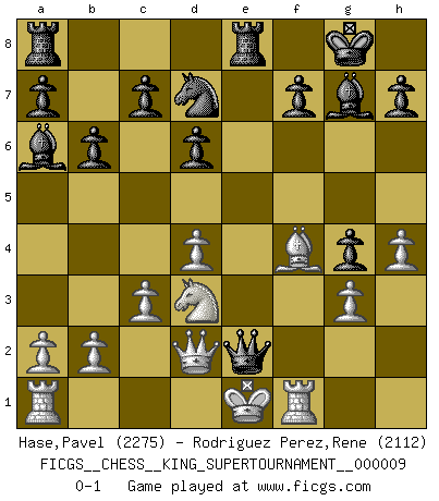 Last move : 0-1 2023 May 22 16:58:47 [Event "FICGS__CHESS__KING_SUPERTOURNAMENT__000009"] [Site "FICGS"] [Date "2023.04.23"] [Round "1"] [White "Hase,Pavel"] [Black "Rodriguez Perez,Rene"] [Result "0-1"] [WhiteElo "2275"] [BlackElo "2112"] 1.e4 e5 2.f4 exf4 3.Nf3 g5 4.h4 g4 5.Ne5 Nf6 6.d4 d6 7.Nd3 Nxe4 8.Bxf4 Bg7 9.c3 O-O 10.Be2 Re8 11.g3 Qe7 12.Nd2 Nd7 13.Nxe4 Qxe4 14.Nf2 Qg2 15.Qd2 b6 16.Rf1 Ba6 17.Nd3 Qxe2+ 0-1 Follow this game move after move (download)Discovered check is the dive bomber of the Chessboard. (Reuben Fine) Das Schach ist nichts für kleine Geister, es beansprucht einen vollen Mann, der sich nicht sklavisch an das Überlieferte hält, sondern selbständig die Tiefen des Spiels zu ergründen sucht. (Wilhelm Steinitz) No solamente yo pronostico su triunfo sobre Botvinnik, sino que me adelanto y digo que probablemente Fischer es el jugador de Ajedrez mas grande que haya existido. (John Collins) Ne tendez aucun piège pour le plaisir ! Ne jouez rien dans l'espoir que l'adversaire réagisse de façon stupide ! Prenez toujours pour acquis que l'adversaire va trouver le meilleur coup ! Ne jouez jamais de coup dans l'espoir que l'adversaire ne voie pas la menace ! Chacun de vos coups doit améliorer la position d'une façon ou d'une autre. A proverb is a short sentence based on long experience. (Miguel de Cervantes)