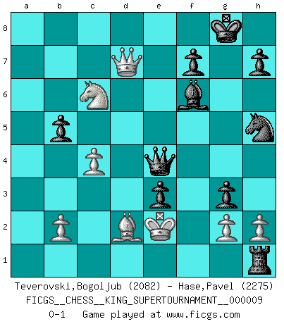 Last move : 0-1 2023 May 16 21:6:54 [Event "FICGS__CHESS__KING_SUPERTOURNAMENT__000009"] [Site "FICGS"] [Date "2023.04.23"] [Round "1"] [White "Teverovski,Bogoljub"] [Black "Hase,Pavel"] [Result "0-1"] [WhiteElo "2082"] [BlackElo "2275"] 1.e4 e5 2.f4 exf4 3.Bc4 Qh4+ 4.Kf1 d6 5.Nc3 Be6 6.Bb3 Nf6 7.Nf3 Qh6 8.d4 Bxb3 9.axb3 c6 10.Qd3 Be7 11.Ne2 g5 12.c4 Qg6 13.Nc3 Nh5 14.d5 O-O 15.Nd4 Re8 16.dxc6 bxc6 17.Bd2 a6 18.b4 Bf6 19.b5 Nd7 20.Nxc6 axb5 21.Rxa8 Rxa8 22.Qxd6 Ra1+ 23.Kf2 Rxh1 24.Qxd7 g4 25.Nd5 g3+ 26.Ke2 Qxe4+ 27.Ne3 fxe3 0-1 Follow this game move after move (download)It is the aim of the modern school, not to treat every position according to one general law, but according to the principle inherent in the position. (Richard Reti) Wer sich die Fähigkeit anerziehen will im Schach selbstständig zu denken, der muß alles meiden, was leblos ist: ausgeklügelte Theorien, die sich auf sehr wenige Beispiele und eine Menge Hirngespinste stützen. (Emanuel Lasker) Cuando no sepas que mover, espera por una idea que se le venga a la la cabeza de tu oponente. Tenlo por seguro de que esa idea estará incorrecta. (Siegbert Tarrasch) La solitude du joueur d'Echecs à l'approche du mat est semblable à celle du condamné. (Francis Szpiner) If you lose the game you should win the analysis! (Proverb)