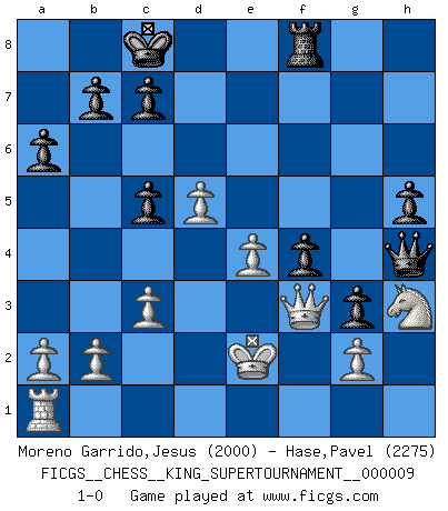 Last move : 1-0 2023 June 11 20:33:44 [Event "FICGS__CHESS__KING_SUPERTOURNAMENT__000009"] [Site "FICGS"] [Date "2023.04.23"] [Round "1"] [White "Moreno Garrido,Jesus"] [Black "Hase,Pavel"] [Result "1-0"] [WhiteElo "2000"] [BlackElo "2275"] 1.e4 e5 2.f4 exf4 3.Bc4 Qh4+ 4.Kf1 d6 5.Nc3 Be6 6.Bxe6 fxe6 7.Nf3 Qh6 8.Nb5 Kd7 9.d4 g5 10.d5 Be7 11.Nfd4 Nf6 12.Nxe6 Na6 13.Nbd4 Nc5 14.Nf5 Qg6 15.Nxc5+ dxc5 16.Qd3 a6 17.Bd2 Bd6 18.Bc3 Rhe8 19.Bxf6 Qxf6 20.c3 Qg6 21.h4 g4 22.h5 Qg5 23.h6 Be5 24.Qc4 g3 25.Qe2 Rf8 26.Rh5 Qg6 27.Kg1 Rae8 28.Nh4 Qb6 29.Nf3 Qf6 30.Rf5 Qxh6 31.Rxe5 Kc8 32.Rxe8+ Rxe8 33.Kf1 Qh1+ 34.Ng1 Qh4 35.Qf3 h5 36.Nh3 Rf8 37.Ke2 1-0 Follow this game move after move (download)I feel as if I were a piece in a game of Chess, when my opponent says of it: That piece cannot be moved. (Soren Kierkegaard) Im Blitz ist es einfacher mit einer Figur weniger anzugreifen, als sich mit einer Mehrfigur zu verteidigen. (Mikhail Nekhemyevich Tal) El Ajedrez es un juego de pelea el cual es puramente intelectual e incluye la suerte. (Richard Reti) Pour moi, les échecs ne sont pas un jeu mais un art. (Alexandre Alekhine) Wisdom is the reward you get for a lifetime of listening when you'd have preferred to talk. (Doug Larson)