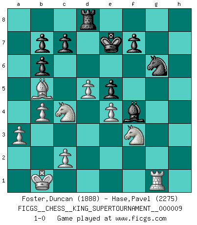 Last move : 1-0 2023 May 25 15:7:2 [Event "FICGS__CHESS__KING_SUPERTOURNAMENT__000009"] [Site "FICGS"] [Date "2023.04.23"] [Round "1"] [White "Foster,Duncan"] [Black "Hase,Pavel"] [Result "1-0"] [WhiteElo "1888"] [BlackElo "2275"] 1.e4 e5 2.f4 exf4 3.Nf3 g5 4.d4 Bg7 5.h4 h6 6.hxg5 hxg5 7.Rxh8 Bxh8 8.g3 Nc6 9.d5 Ne5 10.gxf4 gxf4 11.Bxf4 d6 12.Bxe5 dxe5 13.Bb5+ Kf8 14.Qe2 Bg4 15.Nbd2 Ne7 16.O-O-O Ng6 17.Rg1 Qf6 18.Rxg4 Bg7 19.Qe3 Qb6 20.Qxb6 axb6 21.a3 Bh6 22.Kb1 Rd8 23.Nc4 Bf4 24.Rg1 Ke7 25.b4 1-0 Follow this game move after move (download)The battle for the ultimate truth will never be won. And that's why Chess is so fascinating. (Hans Kmoch) Um dein Spiel zu verbessern musst du zuallererst das Endspiel studieren, denn diese kann unabhängig studiert werden. Die Eröffnung und das Mittelspiel müssen immer in Bezug gesetzt werden zum Endspiel. (José Raúl Capablanca) Fischer es una tragedia del Ajedrez Americano a la par con Morphy y Pillsbury. (Mig Greengard) Si rien de grave n'est détecté lors de l'analyse d'une position, on joue alors le coup. Seconde règle de Blumenfeld. I've never seen so many men wasted so badly. (Blondie in The Good, The Bad and The Ugly)