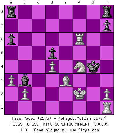 Last move : 1-0 2023 June 10 7:32:48 [Event "FICGS__CHESS__KING_SUPERTOURNAMENT__000009"] [Site "FICGS"] [Date "2023.04.23"] [Round "1"] [White "Hase,Pavel"] [Black "Kehayov,Yulian"] [Result "1-0"] [WhiteElo "2275"] [BlackElo "1777"] 1.e4 e5 2.f4 exf4 3.Nc3 Qh4+ 4.Ke2 Nf6 5.Nf3 Qh5 6.d4 d5 7.e5 Ne4 8.Nxd5 Na6 9.Nxf4 Qf5 10.Qd3 Ng5 11.Qxf5 Bxf5 12.Nxg5 Bxc2 13.Kf2 Nb4 14.a3 Nc6 15.Bb5 a6 16.Bxc6+ bxc6 17.Be3 Bb3 18.Rac1 Ba4 19.e6 fxe6 20.Ngxe6 Bd6 21.Nxg7+ Kf7 22.Nge6 Bb3 23.Ng5+ Kf6 24.Ne4+ Kf5 25.Nxd6+ cxd6 26.Rxc6 d5 27.g4+ Kxg4 28.Rf6 1-0 Follow this game move after move (download)Fischer sacrificed virtually everything most of us weakies (to use his term) value, respect, and cherish, for the sake of an artful, often beautiful board game, for the ambivalent privilege of being its greatest master. (Paul Kollar) Wie gewinnt Tal? Er entwickelt alle seine Figuren in die Brettmitte und opfert sie dann irgendwo. (Robert James Fischer) En un gambito tu regalas un Peón por el bién de tomar un juego perdido. (Samuel Standige Boden) Le jeu d'échecs fait naître et fortifie en nous plusieurs qualités précieuses dans le cours de l'existence, telles que la prévoyance, la circonspection, la prudence, et la persévérance. (Benjamin Franklin - 1783, la morale des échecs) The ultimate in disposing one's troops is to be without ascertainable shape. Then the most penetrating spies cannot pry in nor can the wise lay plans against you. (Sun Tzu)