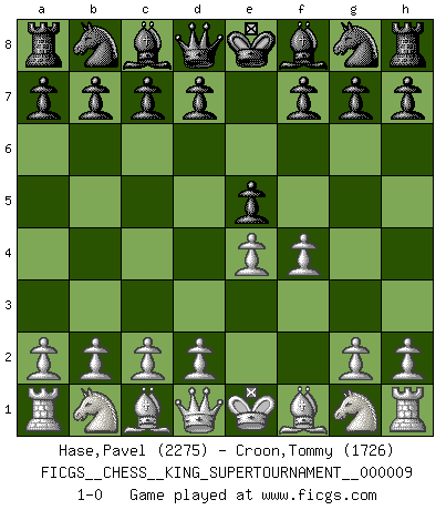 Last move : 1-0 2023 May 23 7:2:35 [Event "FICGS__CHESS__KING_SUPERTOURNAMENT__000009"] [Site "FICGS"] [Date "2023.04.23"] [Round "1"] [White "Hase,Pavel"] [Black "Croon,Tommy"] [Result "1-0"] [WhiteElo "2275"] [BlackElo "1726"] 1.e4 e5 2.f4 1-0 This chess game has been lost on time (started : 2023.04.23 2:2:48) Follow this game move after move (download)Mistrust is the most necessary characteristic of the Chess player. (Siegbert Tarrasch) Modernes Schach sorgt sich zuviel um Dinge wie Bauernstruktur usw. Vergessen Sie das, Schachmatt beendet das Spiel! (Nigel Short) Los errores estan ahí, esperando a que se cometan. (Savielly Tartakower) A ce moment-là, je menaçais de comprendre la position ! (Clément L'Heureux) Be who you are, and say what you feel because those who mind don't matter, and those who matter don't mind. (Dr Seuss)
