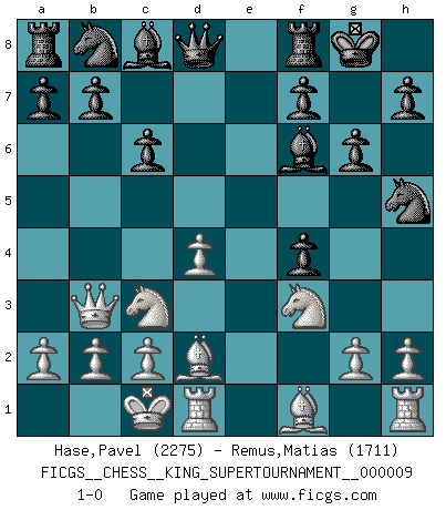 Last move : 1-0 2023 June 8 13:20:39 [Event "FICGS__CHESS__KING_SUPERTOURNAMENT__000009"] [Site "FICGS"] [Date "2023.04.23"] [Round "1"] [White "Hase,Pavel"] [Black "Remus,Matias"] [Result "1-0"] [WhiteElo "2275"] [BlackElo "1711"] 1.e4 e5 2.f4 exf4 3.Nf3 Nf6 4.e5 Nh5 5.Qe2 Be7 6.d4 O-O 7.Nc3 d6 8.Bd2 dxe5 9.Qxe5 g6 10.O-O-O Bf6 11.Qb5 c6 12.Qb3 1-0 This chess game has been lost on time (started : 2023.04.23 2:2:48) Follow this game move after move (download)You know you're going to lose. Even when I was ahead I knew I was going to lose. - On playing against Fischer. (Andrew Soltis) Ich organisiere ein großes Turnier, was mich etwa 120000 Dollar kostet. Ich denke, das ist das erste Mal in der Schachgeschichte, daß ein Schachgroßmeister auch als Mäzen auftritt. (Miguel Najdorf) Una compensación adecuada por un sacrificio es tener una combinación sólida que conduce a una posición ganadora; una compensación adecuada por una metida de pata es dejar a tu oponente arrebatar una derrota de las fauces de la victoria. (Bruce A. Moon) Echiquier : carré parfait, comme la Jérusalem nouvelle décrite par l'auteur de l'Apocalypse, huit cases sur huit, exaltation du chiffre 4, symbole du cosmos aux quatre horizons... où le noir et le blanc, l'ombre et la lumière, le mal et le bien s'entremêlent et se conjuguent. (Robert Couffignal, Le Gambit du poète) If things go wrong, don't go with them. (Roger Babson)