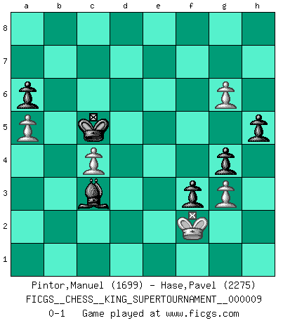 Last move : 0-1 2023 May 31 0:3:19 [Event "FICGS__CHESS__KING_SUPERTOURNAMENT__000009"] [Site "FICGS"] [Date "2023.04.23"] [Round "1"] [White "Pintor,Manuel"] [Black "Hase,Pavel"] [Result "0-1"] [WhiteElo "1699"] [BlackElo "2275"] 1.e4 e5 2.f4 exf4 3.Nf3 d6 4.Bc4 h6 5.O-O g5 6.d4 Bg7 7.c3 Be6 8.Bxe6 fxe6 9.Qb3 Qc8 10.Nbd2 Ne7 11.Nc4 Nbc6 12.h4 g4 13.Nh2 e5 14.d5 Nd8 15.Bd2 h5 16.Qa4+ Qd7 17.Qxd7+ Kxd7 18.b4 Nf7 19.a4 c6 20.dxc6+ bxc6 21.b5 d5 22.bxc6+ Kxc6 23.exd5+ Nxd5 24.Na5+ Kc7 25.c4 Ne7 26.Bb4 Nc6 27.Nxc6 Kxc6 28.a5 Rab8 29.Rab1 Rhd8 30.Be7 Rxb1 31.Rxb1 Rd7 32.Bg5 Nxg5 33.hxg5 e4 34.Nf1 e3 35.g3 e2 36.Re1 exf1Q+ 37.Kxf1 f3 38.Re8 Rd1+ 39.Re1 Rxe1+ 40.Kxe1 Bc3+ 41.Kf2 Kc5 42.g6 a6 0-1 Follow this game move after move (download)For me, Chess is life and every game is like a new life. Every Chess player gets to live many lives in one lifetime. (Eduard Gufeld) Du kannst im Schach nur gut werden, wenn du das Spiel liebst. (Robert James Fischer) Evita las multitudes. Haz independientemente tu propio razonamiento. Trata de ser el jugador de Ajedrez, no la pieza de Ajedrez. (Ralph Charell) Les écrivains ont utilisé les échecs pour analyser les côtés extrêmes de la nature humaine. Dans ce cadre, les échecs offrent un champ d'expérimentation idéal. Mais on pourrait faire la même chose avec la peinture. Et là, en vous référant à Van Gogh, vous ne tirerez pas de conclusion définitive sur les peintres. (Gary Kasparov) At work, the authority of a person is inversely proportional to the number of pens that person is carrying. (Dan Rotaru)