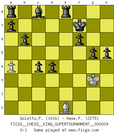 Last move : 0-1 2023 July 8 4:35:26 [Event "FICGS__CHESS__KING_SUPERTOURNAMENT__000009"] [Site "FICGS"] [Date "2023.04.23"] [Round "1"] [White "Goletto,Piero Giuseppe"] [Black "Hase,Pavel"] [Result "0-1"] [WhiteElo "1416"] [BlackElo "2275"] 1.e4 e5 2.f4 exf4 3.Nf3 d6 4.Bb5+ c6 5.O-O Qb6+ 6.d4 cxb5 7.c4 bxc4 8.Nc3 Nf6 9.Ne5 dxe5 10.Nd5 Nxd5 11.exd5 g5 12.Rf2 Qxd4 13.Qxd4 exd4 14.b4 Bxb4 15.Rb1 Bc5 16.g3 fxg3 17.Rg2 gxh2+ 18.Kxh2 f6 19.Re2+ Kf7 20.d6 Bxd6+ 21.Kg1 Nc6 22.a4 b6 23.Rh2 Bxh2+ 24.Kxh2 h5 25.Bd2 Ne5 26.Re1 Nf3+ 27.Kg3 Nxe1 28.Bxe1 Re8 0-1 This chess game has been lost on time (started : 2023.04.23 2:2:48) Follow this game move after move (download)The combination player thinks forward; he starts from the given position, and tries the forceful moves in his mind. (Emanuel Lasker) In der Schule lernt man nichts. Es ist nur Zeitverschwendung. (Robert James Fischer) Los libros de Ajedrez deben de usarse igual como usamos los anteojos: para mejorar la vista, aunque algunos jugadores los quieren usar como si ellos les otorgaran la vision. (José Raúl Capablanca) L'attaque fait le spectacle, la défense gagne les matchs. (Dicton footballistique) Gambling is the son of avarice and the father of despair. (French proverb)