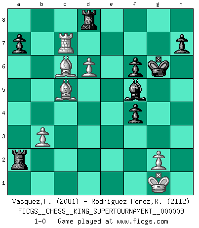 Last move : 1-0 2023 August 30 17:13:58 [Event "FICGS__CHESS__KING_SUPERTOURNAMENT__000009"] [Site "FICGS"] [Date "2023.04.23"] [Round "1"] [White "Vasquez,Fernando"] [Black "Rodriguez Perez,Rene"] [Result "1-0"] [WhiteElo "2081"] [BlackElo "2112"] 1.e4 e5 2.f4 exf4 3.Nf3 g5 4.h4 g4 5.Ne5 Nf6 6.Bc4 d5 7.exd5 Bd6 8.d4 Nh5 9.O-O O-O 10.Nxg4 Qxh4 11.Nh2 Ng3 12.Nc3 Nxf1 13.Bxf1 Bf5 14.Nb5 Nd7 15.c4 Nf6 16.Qf3 Nh5 17.Qf2 Qxf2+ 18.Kxf2 Rae8 19.c5 Be7 20.Nf3 c6 21.dxc6 bxc6 22.Nd6 Bxd6 23.cxd6 Rd8 24.b3 Rfe8 25.Ba3 f6 26.Bc4+ Kg7 27.d5 cxd5 28.Bxd5 Ng3 29.Nd4 Bd7 30.Rc1 Re5 31.Bb7 Kg6 32.Kf3 Kg5 33.Kf2 Bg4 34.Rc7 Nh1+ 35.Kf1 Ng3+ 36.Kf2 Nf5 37.Nxf5 Re2+ 38.Kg1 Bxf5 39.Rg7+ Kh6 40.Rc7 Kg6 41.Bc6 Rxa2 42.Bc5 1-0 Follow this game move after move (download)Personally, I rather look forward to a computer program winning the world Chess Championship. Humanity needs a lesson in humility. (Richard Dawkings) Im Internet Chess Club betrug mein Rating vorübergehend 3350 ELO-Punkte. (Sergej Karjakin) Mi estilo es algo parecido entre un poco de Tal y Petrosian. (Reshevsky) Celui qui prend des risques peut perdre, celui qui n'en prend pas perd toujours. (Xavier Tartacover) Whenever people agree with me, I always feel I must be wrong. (Oscar Wilde)