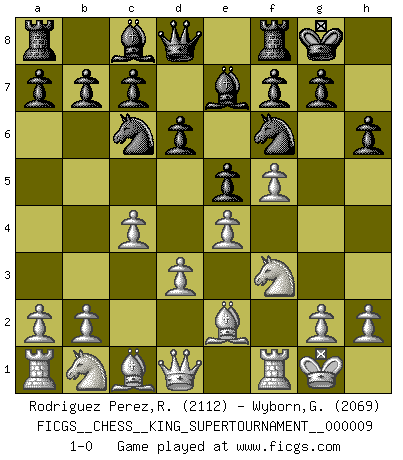Last move : 1-0 2023 June 13 9:4:10 [Event "FICGS__CHESS__KING_SUPERTOURNAMENT__000009"] [Site "FICGS"] [Date "2023.04.23"] [Round "1"] [White "Rodriguez Perez,Rene"] [Black "Wyborn,Graham"] [Result "1-0"] [WhiteElo "2112"] [BlackElo "2069"] 1.e4 e5 2.f4 d6 3.d3 Nc6 4.Nf3 Nf6 5.Be2 Be7 6.O-O O-O 7.c4 h6 8.f5 1-0 This chess game has been lost on time (started : 2023.04.23 2:2:48) Follow this game move after move (download)Different people feel differently about resigning. (Bobby Fischer) Ich habe die Schachforschung dermaßen betrieben, dass sie auf eine wissenschaftliche Basis gestellt wurde. (Mikhail Moiseyevich Botvinik) Solo el jugador con la iniciativa tiene el derecho a atacar. (Wilhelm Steinitz) L'ordinateur a tué l'originalité. Il n'y a plus guère d'aventures sur l'échiquier. (Jacob Murray) The right perception of any matter and a misunderstanding of the same matter do not wholly exclude each other. (Kafka's the trial)