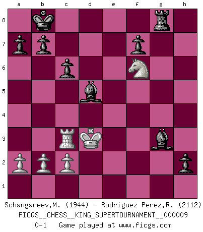 Last move : 0-1 2023 July 14 4:45:42 [Event "FICGS__CHESS__KING_SUPERTOURNAMENT__000009"] [Site "FICGS"] [Date "2023.04.23"] [Round "1"] [White "Schangareev,Mirzian"] [Black "Rodriguez Perez,Rene"] [Result "0-1"] [WhiteElo "1944"] [BlackElo "2112"] 1.e4 e5 2.f4 exf4 3.Nf3 g5 4.h4 g4 5.Ne5 Nf6 6.Nxg4 Nxe4 7.d3 Ng3 8.Bxf4 Qe7+ 9.Be2 Rg8 10.Bxg3 Rxg4 11.Bf2 Rxg2 12.Kf1 Rxf2+ 13.Kxf2 Qf6+ 14.Bf3 d5 15.d4 Be6 16.Nc3 Nd7 17.Kg2 O-O-O 18.Nxd5 Qg7+ 19.Kf1 c6 20.Nf4 Bc4+ 21.Kf2 Qh6 22.Ng2 Ne5 23.Qc1 Qg7 24.Qg5 Nxf3 25.Kxf3 Bd5+ 26.Kg3 Bd6+ 27.Kf2 Qxd4+ 28.Ne3 Qd2+ 29.Kf1 Bxh1 30.Rd1 Qh2 31.Qg4+ Kb8 32.Rd3 h5 33.Qf5 Qxh4 34.Qf2 Qxf2+ 35.Kxf2 Be4 36.Rc3 h4 37.Rc4 Bg3+ 38.Ke2 Re8 39.Rc3 Bd5 40.Kd3 h3 41.Ng4 Rg8 42.Nf6 h2 0-1 Comment by player 1 : Mirzian Schangareev : ¡Buenas noches! Terminemos nuestro juego ahora mismo... ¿Por qué esperar? Follow this game move after move (download)In Chess, at least, the brave inherit the earth. (Edmar Mednis) Ein unbeabsichtigtes Patt ist der Gipfel der Dummheit. (Anonymous) Un buen jugador siempre tiene buena suerte. (José Raúl Capablanca) Les Echecs, c'est l'art de la guerre sans les charniers, c'est la résurrection des morts tombés au champ d'honneur, l'espoir perpétuel, la suprématie de l'intelligence sur la force, la culture de l'esprit. (F. Szpiner) The real voyage of discovery consists not in seeking new lands but in seeing with new eyes. (Marcel Proust)