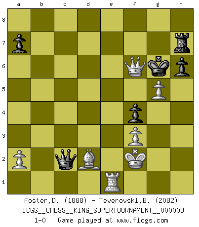 Last move : 1-0 2023 May 20 23:35:38 [Event "FICGS__CHESS__KING_SUPERTOURNAMENT__000009"] [Site "FICGS"] [Date "2023.04.23"] [Round "1"] [White "Foster,Duncan"] [Black "Teverovski,Bogoljub"] [Result "1-0"] [WhiteElo "1888"] [BlackElo "2082"] 1.e4 e5 2.f4 exf4 3.Nf3 d6 4.d4 g5 5.Nc3 Bg7 6.h4 h6 7.Bc4 Be6 8.Bxe6 fxe6 9.Qe2 Qd7 10.hxg5 Nc6 11.d5 Nce7 12.dxe6 Qxe6 13.Qb5+ c6 14.Qxb7 Bxc3+ 15.bxc3 Qxe4+ 16.Kf2 Qxc2+ 17.Bd2 Rd8 18.Rae1 Rd7 19.Qc8+ Rd8 20.Qxc6+ Kf8 21.Qc7 Rc8 22.Qxd6 Rxc3 23.Rxe7 Rxf3+ 24.gxf3 Nxe7 25.Re1 Rh7 26.Qd8+ Kf7 27.Qxe7+ Kg6 28.Qf6+ 1-0 Follow this game move after move (download)A man without frontiers. He didn't divide the East and the West, he brought them together in their admiration for him. (Ljubomir Ljubojevic, about Bobby Fischer's death) Ich organisiere ein großes Turnier, was mich etwa 120000 Dollar kostet. Ich denke, das ist das erste Mal in der Schachgeschichte, daß ein Schachgroßmeister auch als Mäzen auftritt. (Miguel Najdorf) Yo no creo en la psicología. Yo creo en las buenas movidas. (Bobby Fischer) Les échecs, c'est l'imagination. (David Bronstein) There are lots of people who mistake their imagination for their memory. (Josh Bilings)