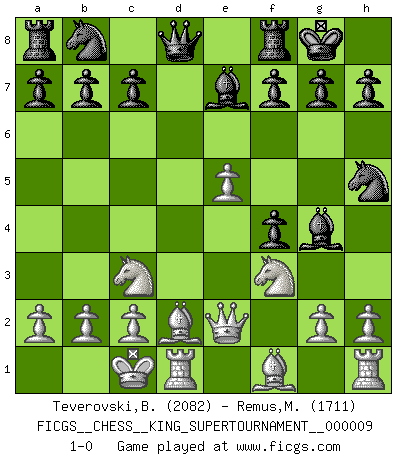 Last move : 1-0 2023 June 16 0:32:38 [Event "FICGS__CHESS__KING_SUPERTOURNAMENT__000009"] [Site "FICGS"] [Date "2023.04.23"] [Round "1"] [White "Teverovski,Bogoljub"] [Black "Remus,Matias"] [Result "1-0"] [WhiteElo "2082"] [BlackElo "1711"] 1.e4 e5 2.f4 exf4 3.Nf3 Nf6 4.e5 Nh5 5.Qe2 Be7 6.d4 O-O 7.Nc3 d6 8.Bd2 Bg4 9.O-O-O dxe5 10.dxe5 1-0 This chess game has been lost on time (started : 2023.04.23 2:2:48) Follow this game move after move (download)Later, I began to succeed in decisive games. Perhaps because I realized a very simple truth: not only was I worried, but also my opponent. (Mikhail Tal) Stil? Ich habe keinen Stil! (Anatoly Karpov) El Ajedrez, como cualquier actividad creativa, solo puede existir a través del esfuerzo combinado de aquellos que tienen talento creativo y de aquellos que poseen la habilidad de organizar su trabajo creativo. (Mikhail Botvinnik) Karpov est une pièce de musée. (Garry Kasparov) Now be brave and don't look back. Don't look back. (Shmi Skywalker in Star Wars ep.1)