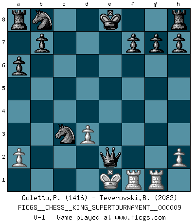 Last move : 0-1 2023 May 8 20:19:49 [Event "FICGS__CHESS__KING_SUPERTOURNAMENT__000009"] [Site "FICGS"] [Date "2023.04.23"] [Round "1"] [White "Goletto,Piero Giuseppe"] [Black "Teverovski,Bogoljub"] [Result "0-1"] [WhiteElo "1416"] [BlackElo "2082"] 1.e4 e5 2.f4 d5 3.Bb5+ c6 4.Nc3 cxb5 5.Nxb5 exf4 6.g3 dxe4 7.d3 a6 8.Nd6+ Bxd6 9.Bxf4 Bxf4 10.gxf4 Qh4+ 11.Kf1 Qxf4+ 12.Nf3 Bh3+ 13.Ke2 exf3+ 14.Kf2 Qh4+ 15.Kxf3 Bg4+ 16.Ke3 Bxd1 17.Raxd1 Nf6 18.Rdf1 Qb4 19.c3 Nd5+ 20.Kd2 Qxb2+ 21.Ke1 Nxc3 22.Rhg1 Qe2+ 0-1 Follow this game move after move (download)Suddenly it was obvious to me in my analysis I had missed what Fischer had found with the greatest of ease at the board. (Mikhail Botvinnik) Ein Isolani verdüstert die Stimmung auf dem ganzen Schachbrett. (Savielly Grigorievitsch Tartakower) No hay un Gran Maestro de Ajedrez que sea normal; solo se diferencían ellos por la magnitud de su locura. (Viktor Korchnoi) Vous n'êtes pas toujours obligé de jouer le meilleur coup. Un coup doit être actif, entreprenant, correct et beau ! (David Bronstein) Happy endings are just stories that haven't finished yet. (Jane Smith in Mr & Mrs Smith)