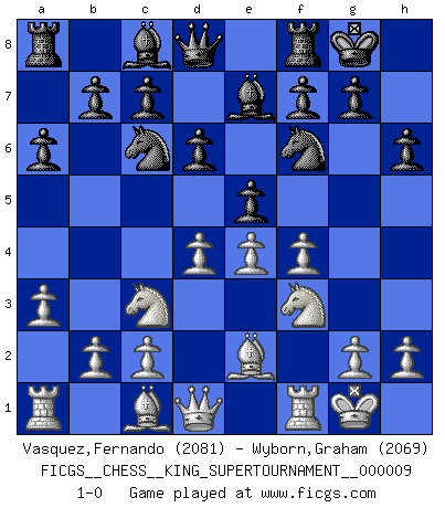 Last move : 1-0 2023 June 15 12:28:32 [Event "FICGS__CHESS__KING_SUPERTOURNAMENT__000009"] [Site "FICGS"] [Date "2023.04.23"] [Round "1"] [White "Vasquez,Fernando"] [Black "Wyborn,Graham"] [Result "1-0"] [WhiteElo "2081"] [BlackElo "2069"] 1.e4 e5 2.f4 d6 3.d3 Nc6 4.Nf3 Nf6 5.Nc3 Be7 6.a3 O-O 7.Be2 h6 8.O-O a6 9.d4 1-0 This chess game has been lost on time (started : 2023.04.23 2:2:48) Follow this game move after move (download)It's just you and your opponent at the board and you're trying to prove something. (Bobby Fischer) Ich liebe den Moment, wenn ich das Ego meines Gegenüber breche. (Robert James Fischer) Creo que una cierta cantidad de temperamento es esperada de los genios del Ajedrez. (Ron Gross) Même si vous avez un bon coup à faire, regardez toujours s'il n'y en a pas un qui lui soit préférable. (Pedro Damiano) Success without honor is an unseasoned dish; it will satisfy your hunger, but it won't taste good. (Joe Paterno)