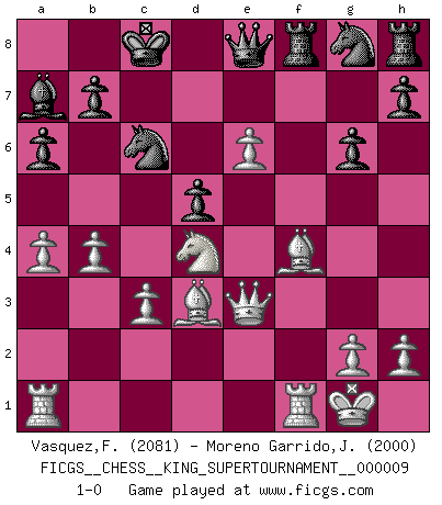 Last move : 1-0 2023 June 26 10:2:40 [Event "FICGS__CHESS__KING_SUPERTOURNAMENT__000009"] [Site "FICGS"] [Date "2023.04.23"] [Round "1"] [White "Vasquez,Fernando"] [Black "Moreno Garrido,Jesus"] [Result "1-0"] [WhiteElo "2081"] [BlackElo "2000"] 1.e4 e5 2.f4 d5 3.exd5 c6 4.Qe2 cxd5 5.fxe5 Bf5 6.Nf3 Nc6 7.d4 Bg4 8.c3 Be7 9.Qf2 Bxf3 10.Qxf3 f6 11.Bd3 g6 12.O-O Qd7 13.Bf4 O-O-O 14.Nd2 a6 15.Nb3 fxe5 16.dxe5 Qe6 17.Qf2 Rf8 18.Nd4 Qd7 19.e6 Qe8 20.Qe3 Bc5 21.b4 Ba7 22.a4 1-0 Follow this game move after move (download)Bobby Fischer's current state of mind is indeed a tragedy. One of the world's greatest Chess players - the pride and sorrow of American Chess. (Frank Brady) Im Hotelzimmer gab es nur zwei Schaben. (Über die Turnierbedingungen) (Peter Swidler) Cuando la partida de Ajedrez termina, el Peón y el Rey regresan a la misma caja. (Irish saying) Il a essayé de se convaincre qu'il pourrait empêcher toutes les erreurs et ne jamais perdre. L'horreur ! Gary Kasparov au sujet de Robert Fischer. Tomorrow's what you make of it. (Horatio Caine, C.S.I. Miami)