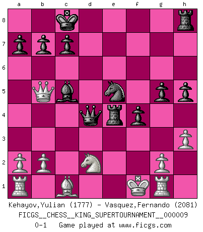 Last move : 0-1 2023 July 7 10:47:59 [Event "FICGS__CHESS__KING_SUPERTOURNAMENT__000009"] [Site "FICGS"] [Date "2023.04.23"] [Round "1"] [White "Kehayov,Yulian"] [Black "Vasquez,Fernando"] [Result "0-1"] [WhiteElo "1777"] [BlackElo "2081"] 1.e4 e5 2.f4 exf4 3.Bc4 Qh4+ 4.Kf1 d6 5.d4 Nc6 6.Nf3 Bg4 7.c3 Qf6 8.Be2 h6 9.h3 Bd7 10.Qd2 g5 11.Qd1 Qg7 12.Kf2 O-O-O 13.Re1 h5 14.Rg1 Nf6 15.Bd3 d5 16.e5 Ne4+ 17.Ke1 f6 18.Nbd2 fxe5 19.Nxe4 dxe4 20.Bxe4 exd4 21.cxd4 Re8 22.Nd2 Qxd4 23.Kf1 Rxe4 24.Qf3 Ne5 25.Qb3 Bb5+ 26.Qxb5 Bc5 0-1 Follow this game move after move (download)In blitz, the Knight is stronger than the Bishop. (Vlastimil Hort) Alles was ich jemals tun will ist Schach spielen. (Robert James Fischer) El Ajedrez es un terrible juego. Si no controlas el centro, tu oponente tiene una posición mas holgada. Si tienes control del centro, ¡entonces realmente tu tienes algo de que preocuparte!. (Siegbert Tarrasch) Le système Elo représente seulement une moyenne. Il est simplement un indicateur de votre stabilité. (Anatoli Karpov) The general who wins the battle makes many calculations in his temple before the battle is fought. The general who loses makes but few calculations beforehand. (Sun Tzu)