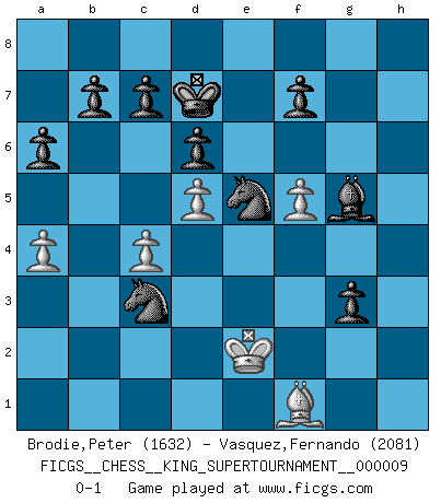 Last move : 0-1 2023 July 9 13:59:2 [Event "FICGS__CHESS__KING_SUPERTOURNAMENT__000009"] [Site "FICGS"] [Date "2023.04.23"] [Round "1"] [White "Brodie,Peter"] [Black "Vasquez,Fernando"] [Result "0-1"] [WhiteElo "1632"] [BlackElo "2081"] 1.e4 e5 2.f4 exf4 3.Nf3 g5 4.d4 g4 5.Ng1 Qh4+ 6.Ke2 Bh6 7.Qd3 Nc6 8.g3 fxg3 9.Qxg3 Qxg3 10.hxg3 Bxc1 11.c3 Bxb2 12.d5 Ne5 13.Na3 Bxa1 14.Nb5 Kd8 15.Kd2 a6 16.Nd4 Bb2 17.a4 d6 18.Kc2 Ba3 19.Kb3 Bc1 20.Nge2 Bg5 21.Ka2 h5 22.Kb3 h4 23.gxh4 Rxh4 24.Rxh4 Bxh4 25.Bg2 Nf6 26.Nf5 Bxf5 27.exf5 Kd7 28.c4 Rh8 29.Nf4 Bg5 30.Ne2 Rh2 31.Bf1 Ne4 32.Kc2 g3 33.Kd1 Rxe2 34.Kxe2 Nc3+ 0-1 Follow this game move after move (download)A Chess game is a dialogue, a conversation between a player and his opponent. Each move by the opponent may contain threats or be a blunder, but a player cannot defend against threats or take advantage of blunders if he does not first ask himself: What is my opponent planning after each move ? (Bruce A. Moon) Ich moechte nie einem Club beitreten, der Leute wie mich als Mitglieder aufnimmt. (Woody Allen) Cuando veas una buena jugada, trata de encontrar otra mejor. (Emanuel Lasker) Votre prénom est 'Tactique', votre deuxième prénom est 'Tactique' et votre nom est 'Tactique'. (Ken Smith) To send light into the darkness of men's hearts - such is the duty of the artist. (Schumann)