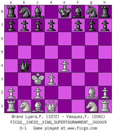 Last move : 0-1 2023 May 8 8:57:55 [Event "FICGS__CHESS__KING_SUPERTOURNAMENT__000009"] [Site "FICGS"] [Date "2023.04.23"] [Round "1"] [White "Brand Lyard,Paul"] [Black "Vasquez,Fernando"] [Result "0-1"] [WhiteElo "1372"] [BlackElo "2081"] 1.e4 e5 2.f4 exf4 3.d3 Qh4+ 4.g3 fxg3 5.Kd2 g2 6.Bxg2 Qg5+ 7.Kc3 Qa5+ 8.b4 Qxb4+ 0-1 Follow this game move after move (download)When you don't know what to do, wait for your opponent to get an idea - it's sure to be wrong. (Tarrasch) Ich glaube, ich kenne inzwischen die Gründe für mein Versagen: schachliche Charakterfehler. Ich war nie ein Wunderkind und in meiner gesamten menschlichen Entwicklung immer zu langsam. (Viktor Kortschnoi) Fischer es el jugador mas fuerte del mundo. De hecho, el jugador mas fuerte que jamas haya existido. (Larry Evans) Karpov est une pièce de musée. (Garry Kasparov) I feel so... helpless. (C-3PO in Star Wars ep.3)