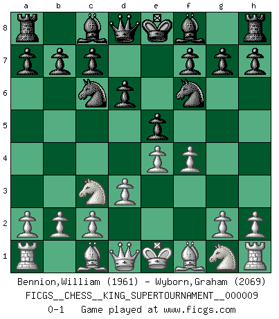 Last move : 0-1 2023 May 26 0:16:34 [Event "FICGS__CHESS__KING_SUPERTOURNAMENT__000009"] [Site "FICGS"] [Date "2023.04.23"] [Round "1"] [White "Bennion,William"] [Black "Wyborn,Graham"] [Result "0-1"] [WhiteElo "1961"] [BlackElo "2069"] 1.e4 e5 2.f4 d6 3.d3 Nc6 4.Nc3 Nf6 0-1 This chess game has been lost on time (started : 2023.04.23 2:2:48) Follow this game move after move (download)Weak points or holes in the opponent's position must be occupied by pieces not Pawns. (Siegbert Tarrasch) Gewinnen beim Schach fördert das Selbstvertrauen. Beim Sex spüre ich sowas nicht... (Garry Kasparov) El Ajedrez se juega con la mente... ¡no con las manos!. (Renaud y Kahn) La conception d'un plan est le processus par lequel un joueur exploite les avantages de sa position tout en s'efforçant d'en réduire au minimum les inconvénients. Afin de garantir le succès, un plan doit toujours se fonder sur un diagnostic objectif des particularités d'une position. La conception d'un plan est d'autant plus difficile que la position est équilibrée, et grandement facilitée lorsqu'il n'existe qu'un seul plan susceptible de répondre aux exigences de la position. (Harry Golombek) I have opinions of my own - strong opinions - but I don't always agree with them. (George Bush)