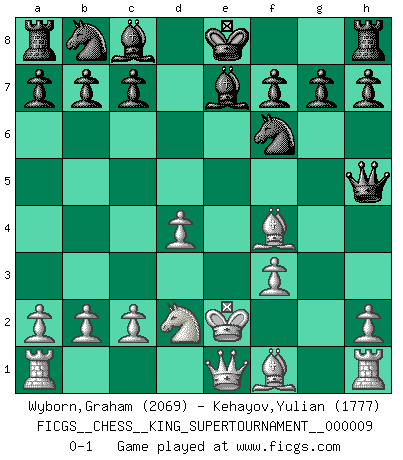 Last move : 0-1 2023 June 2 20:7:42 [Event "FICGS__CHESS__KING_SUPERTOURNAMENT__000009"] [Site "FICGS"] [Date "2023.04.23"] [Round "1"] [White "Wyborn,Graham"] [Black "Kehayov,Yulian"] [Result "0-1"] [WhiteElo "2069"] [BlackElo "1777"] 1.e4 e5 2.f4 exf4 3.d4 Qh4+ 4.Ke2 d5 5.Nf3 Qh5 6.Bxf4 dxe4 7.Nbd2 exf3+ 8.gxf3 Nf6 9.Qe1 Be7 0-1 This chess game has been lost on time (started : 2023.04.23 2:2:48) Follow this game move after move (download)Blessed be the memory of him who gave the world this immortal game. (A. G. Gardiner) Ich bin Weltmeister und muß mit niemandem irgend etwas diskutieren. (Viswanathan Anand) Por la belleza de sus partidas, la claridad de su juego y lo brillante de sus ideas, Fischer se creó el mismo como un artista de la misma estatura como Brahms, Rembrandt y Shakespeare. (David Levy) RxDa4 pat (...) The man who strikes first admits that his ideas have given out. (Chinese proverb)