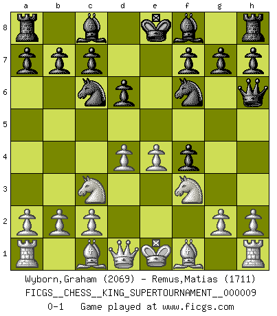Last move : 0-1 2023 June 18 2:56:35 [Event "FICGS__CHESS__KING_SUPERTOURNAMENT__000009"] [Site "FICGS"] [Date "2023.04.23"] [Round "1"] [White "Wyborn,Graham"] [Black "Remus,Matias"] [Result "0-1"] [WhiteElo "2069"] [BlackElo "1711"] 1.e4 e5 2.f4 exf4 3.d4 Qh4+ 4.Kd2 Nf6 5.Nf3 Qh6 6.Nc3 d6 7.Ke1 Nc6 0-1 This chess game has been lost on time (started : 2023.04.23 2:2:48) Follow this game move after move (download)The boy (then a 12 year old boy named Anatoly Karpov) doesn't have a clue about Chess, and there's no future at all for him in this profession. (Mikhail Botvinnik) Das Schachspiel hat wie die Liebe, die Musik, die Fähigkeit, den Menschen glücklich zu machen. Ich habe ein leises Gefühl des Bedauerns für jeden, der das Schachspiel nicht kennt, so wie ich jeden bedaure, der die Liebe nicht kennt. (Siegbert Tarrasch) Alguna parte de un error es siempre correcto. (Savielly Tartakover) Lorsque vous vous retrouvez devant une position atroce, ne tendez pas un ultime piège dérisoire avec l'intention d'abandonner si l'adversaire le déjoue ! Faites-vous plutôt un devoir de résister comme si votre vie en dépendait. Jouez le coup qui vous déplairait au centuple si vous étiez dans la peau de votre tortionnaire ! Is not life a hundred times too short to bore ourselves ? (Friedrich Nietzsche)