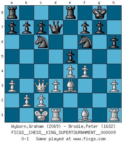Last move : 0-1 2023 June 28 2:46:35 [Event "FICGS__CHESS__KING_SUPERTOURNAMENT__000009"] [Site "FICGS"] [Date "2023.04.23"] [Round "1"] [White "Wyborn,Graham"] [Black "Brodie,Peter"] [Result "0-1"] [WhiteElo "2069"] [BlackElo "1632"] 1.e4 e5 2.f4 d6 3.Nc3 Nc6 4.Nf3 Bg4 5.d3 Nf6 6.fxe5 dxe5 7.h3 Bh5 8.Be3 Bb4 9.Qd2 O-O 10.O-O-O Bxf3 11.gxf3 Bxc3 12.Qxc3 h6 13.a3 Qd7 14.f4 Rfe8 0-1 This chess game has been lost on time (started : 2023.04.23 2:2:48) Follow this game move after move (download)Becoming successful at Chess allows you to discover your own personality. That's what I want for the kids I teach. (Saudin Robovic) Ein Isolani verdüstert die Stimmung auf dem ganzen Schachbrett. (Savielly Grigorievitsch Tartakower) Nada excita más a Grandes Maestros aburridos que una novedad teórica. (Dominic Lawson) Dans le domaine de la peinture, de la gravure et de la sculpture, dès la première décennie de notre siècle, les artistes abandonnent la représentation de la partie d'échecs pour se concentrer sur les pièces, sur les échiquiers et sur toutes les variations auxquelles les unes et les autres peuvent donner lieu. On passe en quelque sorte d'un thème social à un thème musical (au sens de la musica médiévale, c'est-à-dire d'une notion qui inclue le rythme, l'harmonie, la construction et la déconstruction, etc.). Graphiquement et picturalement, l'échiquier apparaît comme une structure ouverte, dynamique, d'une richesse infinie, autorisant toutes les combinatoires et débouchant sur des mouvements et des rythmes de nature exponentielle. (Michel Pastoureau) The mind is like a parachute, it only functions when its open. (Unknown)