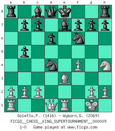 Last move : 1-0 2023 June 17 14:45:1 [Event "FICGS__CHESS__KING_SUPERTOURNAMENT__000009"] [Site "FICGS"] [Date "2023.04.23"] [Round "1"] [White "Goletto,Piero Giuseppe"] [Black "Wyborn,Graham"] [Result "1-0"] [WhiteElo "1416"] [BlackElo "2069"] 1.e4 e5 2.f4 d6 3.Nf3 Nc6 4.Bb5 a6 5.O-O Nf6 6.Nc3 axb5 7.d4 exd4 8.Ne2 Be7 9.Nexd4 Nxe4 10.Re1 Nf6 11.Nh4 Nxd4 12.Be3 1-0 This chess game has been lost on time (started : 2023.04.23 2:2:48) Follow this game move after move (download)No Chess Grandmaster is normal; they only differ in the extent of their madness. (Viktor Korchnoi) Ja, jede Frau in Holland liebt mich bestimmt, und alle Männer hassen mich. (Loek van Wely) El Ajedrez es realmente noventa y nueve por ciento calculación. (Soltis) 'L'échange des dames est un coup dur pour les deux adversaires...' Un journaliste lors d'une partie du match Spassky-Fischer Who needs drugs and alcohol if he can play Big Chess at FICGS ? (Heinz-Georg Lehnhoff)