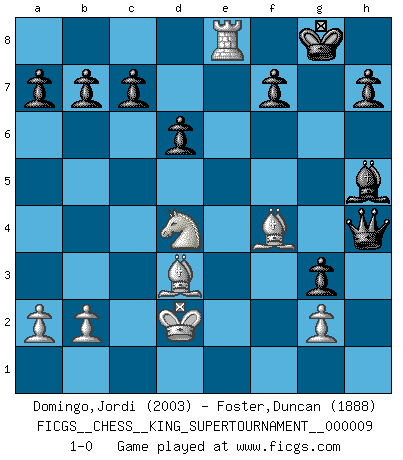 Last move : 1-0 2023 June 12 22:3:4 [Event "FICGS__CHESS__KING_SUPERTOURNAMENT__000009"] [Site "FICGS"] [Date "2023.04.23"] [Round "1"] [White "Domingo,Jordi"] [Black "Foster,Duncan"] [Result "1-0"] [WhiteElo "2003"] [BlackElo "1888"] 1.e4 e5 2.f4 exf4 3.Nf3 g5 4.h4 g4 5.Ne5 Nf6 6.d4 d6 7.Nd3 Nxe4 8.Bxf4 Bg7 9.c3 O-O 10.Be2 Re8 11.Nd2 Nc6 12.Nxe4 Rxe4 13.Qd2 Bxd4 14.cxd4 Nxd4 15.Nc1 Qe7 16.Kd1 Bf5 17.Rf1 Re8 18.Bd3 g3 19.Nb3 Bg4+ 20.Kc1 Re2 21.Nxd4 Rxd2 22.Kxd2 Qxh4 23.Rae1 Rxe1 24.Rxe1 Bh5 25.Re8+ 1-0 Follow this game move after move (download)By playing at Chess then, we may learn: First: Foresight... Second: Circumspection... Third: Caution... And lastly, we learn by Chess the habit of not being discouraged by present bad appearances in the state of our affairs, the habit of hoping for a favorable chance, and that of persevering in the secrets of resources. (Benjamin Franklin) Ein Teil des Fehlers ist immer korrekt. (Savielly Grigorievitsch Tartakower) Aún el Rey más flojo huye despavorido ante la amenaza de un Jaque doble. (Aaron Nimzowitsch) La victoire dans une partie d'Echecs appartient la plupart du temps à celui qui voit un peu plus loin que l'adversaire. (Lasker) The worth of a book is to be measured by what you can carry away from it. (James Bryce)