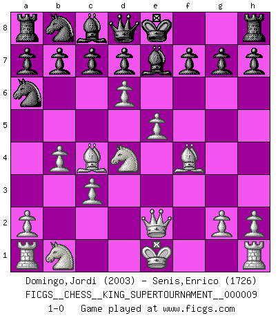 Last move : 1-0 2023 May 10 22:28:18 [Event "FICGS__CHESS__KING_SUPERTOURNAMENT__000009"] [Site "FICGS"] [Date "2023.04.23"] [Round "1"] [White "Domingo,Jordi"] [Black "Senis,Enrico"] [Result "1-0"] [WhiteElo "2003"] [BlackElo "1726"] 1.e4 e5 2.f4 exf4 3.Bc4 Nh6 4.Nf3 Nc6 5.d4 Bb4+ 6.c3 Be7 7.Bxf4 Ng4 8.d5 Nb8 9.Nd4 Nf6 10.e5 Ne4 11.Qe2 Nc5 12.b4 Nca6 13.d6 1-0 Follow this game move after move (download)Fischer prefers to enter Chess history alone. (Miguel Najdorf) Im Leben werden Partien nie so unstrittig gewonnen wie im Spiel (Emanuel Lasker) El Ajedrez es un terrible juego. Si no controlas el centro, tu oponente tiene una posición mas holgada. Si tienes control del centro, ¡entonces realmente tu tienes algo de que preocuparte!. (Siegbert Tarrasch) Roi des jeux et jeu des rois, les échecs portent en eux un sentiment d'infini. Ils donnent à celui qui s'est efforcé d'en approfondir les arcanes l'impression de n'être pas à la mesure de l'homme; en fait, ils constituent un résumé de l'univers, un microcosme, et figurent cette grande échelle qui, dans les plans de la lumière descend jusqu'à la matière, qui des abîmes insondables remonte jusqu'en l'infini de Dieu. (Pyrame) If you are going through hell, keep going. (Winston Churchill)