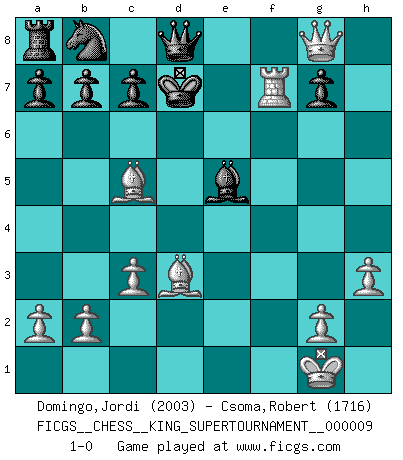 Last move : 1-0 2023 May 17 0:20:48 [Event "FICGS__CHESS__KING_SUPERTOURNAMENT__000009"] [Site "FICGS"] [Date "2023.04.23"] [Round "1"] [White "Domingo,Jordi"] [Black "Csoma,Robert"] [Result "1-0"] [WhiteElo "2003"] [BlackElo "1716"] 1.e4 e5 2.f4 exf4 3.Nf3 d6 4.d4 Nf6 5.Nc3 Be7 6.Bxf4 O-O 7.Bd3 Bg4 8.h3 Bxf3 9.Qxf3 Nc6 10.Be3 Re8 11.O-O Bf8 12.Nd5 Be7 13.c3 Rf8 14.Rae1 Nb8 15.Nxf6+ Bxf6 16.e5 dxe5 17.Qf5 Re8 18.Qxh7+ Kf8 19.dxe5 Rxe5 20.Bc5+ Ke8 21.Rxe5+ Bxe5 22.Qg8+ Kd7 23.Rxf7+ 1-0 Follow this game move after move (download)All Chess players should have a hobby. (Savielly Tartakower) Gegen einen Schachcomputer zu verlieren ist wie Löcher in den Strümpfen zuhaben. Es ist nicht peinlich, solange man der einzige ist der es weiß. (Anonymous) El Ajedrez no es como la vida... ¡tiene reglas!. (Mark Pasternak) La conception d'un plan est le processus par lequel un joueur exploite les avantages de sa position tout en s'efforçant d'en réduire au minimum les inconvénients. Afin de garantir le succès, un plan doit toujours se fonder sur un diagnostic objectif des particularités d'une position. La conception d'un plan est d'autant plus difficile que la position est équilibrée, et grandement facilitée lorsqu'il n'existe qu'un seul plan susceptible de répondre aux exigences de la position. (Harry Golombek) If only faces could talk... (Pat Summerall, Sportscaster during the Super Bowl)