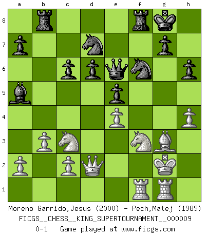 Last move : 0-1 2023 July 3 0:10:46 [Event "FICGS__CHESS__KING_SUPERTOURNAMENT__000009"] [Site "FICGS"] [Date "2023.04.23"] [Round "1"] [White "Moreno Garrido,Jesus"] [Black "Pech,Matej"] [Result "0-1"] [WhiteElo "2000"] [BlackElo "1989"] 1.e4 e5 2.f4 exf4 3.Bc4 Qh4+ 4.Kf1 d6 5.Nc3 Be6 6.Bxe6 fxe6 7.Nf3 Qf6 8.d4 Nd7 9.h4 c6 10.Qe2 e5 11.d5 h6 12.Bd2 Qf7 13.dxc6 bxc6 14.Rg1 Be7 15.g4 fxg3 16.Kg2 Ngf6 17.Raf1 O-O 18.Be1 Rab8 19.b3 Bd8 20.Qd2 Qe6 21.Bxg3 Ba5 0-1 Follow this game move after move (download)My God, Bobby Fischer plays so simply. (Alexei Suetin) Ich habe kein Problem mit Frauen, sondern nur mit dem Niveau ihres Schachspiels (Judith Polgar) El Ajedrez es una guerra en un tablero. El objetivo es aplastar la mente del oponente. (Bobby Fischer) Les Echecs représentent une sphère d'idées créatrices basée sur la volonté des deux protagonistes. (Smyslov) There are more things in heaven and earth than practically anywhere else. (Unknown)