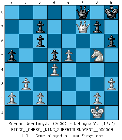 Last move : 1-0 2023 June 7 20:13:14 [Event "FICGS__CHESS__KING_SUPERTOURNAMENT__000009"] [Site "FICGS"] [Date "2023.04.23"] [Round "1"] [White "Moreno Garrido,Jesus"] [Black "Kehayov,Yulian"] [Result "1-0"] [WhiteElo "2000"] [BlackElo "1777"] 1.e4 e5 2.f4 exf4 3.Bc4 Nc6 4.d4 Nf6 5.e5 d5 6.Bb5 Ne4 7.Nf3 Bg4 8.O-O a6 9.Bxc6+ bxc6 10.Bxf4 Be7 11.h3 Bxf3 12.Qxf3 Bg5 13.Nc3 O-O 14.Nxe4 Bxf4 15.Qxf4 Qd7 16.Nc5 Qe7 17.Rae1 a5 18.Re3 Rab8 19.b3 Kh8 20.Qg4 f5 21.Rxf5 Rxf5 22.Qxf5 Rf8 23.Qg4 Qf7 24.Rf3 Qe8 25.Ne6 Rf7 26.Rxf7 Qxf7 27.Ng5 Qf8 28.Qh5 h6 29.Qf7 1-0 Follow this game move after move (download)Chess is in its essence a game, in its form an art, and in its execution a science. (Baron Tassilo) Bogoljubow: Matt in vier Zügen! Tartakower: Ich verbitte mir jede Belästigung! (Savielly Grigorievitsch Tartakower) Muchos se han convertido en Maestros de Ajedrez, nadie se ha convertido en el Maestro del Ajedrez. (Siegbert Tarrasch) Les échecs sont plus proches de l'art de l'assassinat que de l'art de la guerre. (Arturo Perez-Reverte) Whatever you do, don't be bored. This is absolutely the most exciting time we could have possibly hoped to be alive. And things are just starting. (From movie Waking life)