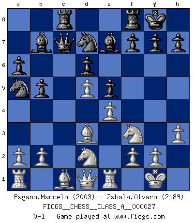 Last move : 0-1 2007 October 14 7:40:26 [Event "FICGS__CHESS__CLASS_A__000027"] [Site "FICGS"] [Date "2007.08.29"] [Round "1"] [White "Pagano,Marcelo"] [Black "Zabala,Alvaro"] [Result "0-1"] [WhiteElo "2003"] [BlackElo "2189"] 1.e4 e5 2.Nf3 Nc6 3.Bb5 a6 4.Ba4 Nf6 5.O-O Be7 6.Re1 b5 7.Bb3 d6 8.c3 O-O 9.h3 Na5 10.Bc2 c5 11.d4 Qc7 12.Nbd2 cxd4 13.cxd4 Bb7 14.d5 Rac8 15.Bd3 Nd7 0-1 Comment by player 1 : Marcelo Pagano : I wish to resign all my games in FICGS because I'm not satisfied with the level chess that i've have been played. So i'll wait you next move for resign! Kind regards! Ruy Lopez : Closed Kingside Castling by player White (move 5) Kingside Castling by player Black (move 8) Player Black won this chess game. Follow this game move after move (download)The game of chess is the touchstone of the intellect. (Goethe) Ich verlor meine Bürgerrechte, mein Gehalt wurde mir nicht mehr bezahlt und ich wurde zensiert und durfte nicht mehr ins Ausland reisen. [nach dem Match Fischer-Taimanov 6:0] (Mark Taimanov) Solo los afeminados hacen el Enroque. (Rob Sillars) Le jeu d'échecs fait naître et fortifie en nous plusieurs qualités précieuses dans le cours de l'existence, telles que la prévoyance, la circonspection, la prudence, et la persévérance. (Benjamin Franklin - 1783, la morale des échecs) Life is the sum of all your choices. (Albert Camus)