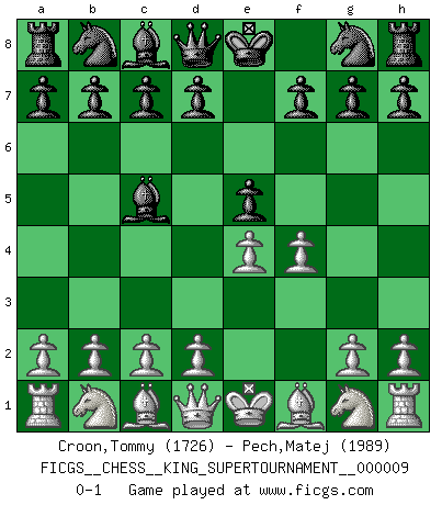 Last move : 0-1 2023 May 29 16:21:10 [Event "FICGS__CHESS__KING_SUPERTOURNAMENT__000009"] [Site "FICGS"] [Date "2023.04.23"] [Round "1"] [White "Croon,Tommy"] [Black "Pech,Matej"] [Result "0-1"] [WhiteElo "1726"] [BlackElo "1989"] 1.e4 e5 2.f4 Bc5 0-1 This chess game has been lost on time (started : 2023.04.23 2:2:48) Follow this game move after move (download)A good sacrifice is one that is not necessarily sound but leaves your opponent dazed and confused. (Rudolph Spielmann) Sitze auf Deine Hände. (Siegbert Tarrasch) Cada Peón es una Reina en potencia. (James Mason) Toutes les manuvres exécutées sur une colonne ouverte ont pour but ultime l'intrusion définitive sur la septième ou la huitième rangée, en plein cur de la position ennemie. (Aaron Nimzovitch) The greatest con, that he ever pulled... was making you believe... that he is you. (Revolver, movie)