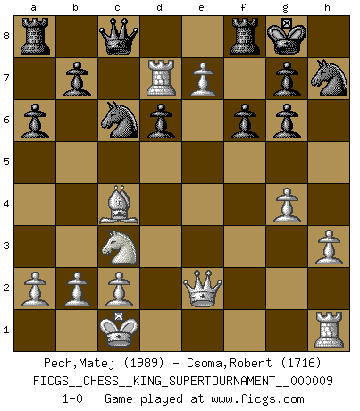 Last move : 1-0 2023 June 30 19:45:49 [Event "FICGS__CHESS__KING_SUPERTOURNAMENT__000009"] [Site "FICGS"] [Date "2023.04.23"] [Round "1"] [White "Pech,Matej"] [Black "Csoma,Robert"] [Result "1-0"] [WhiteElo "1989"] [BlackElo "1716"] 1.e4 e5 2.f4 exf4 3.Nf3 d6 4.Bc4 Be7 5.d4 Nf6 6.Nc3 O-O 7.Bxf4 Bg4 8.h3 Bh5 9.Qe2 Nc6 10.O-O-O Qc8 11.g4 Bg6 12.Nh4 a6 13.Nxg6 hxg6 14.e5 dxe5 15.dxe5 Nh7 16.e6 f6 17.Rd7 Bd6 18.Bxd6 cxd6 19.e7 1-0 Follow this game move after move (download)The Pin is mightier than the sword. (Fred Reinfeld) Wer nie einen Fehler gemacht hat, hat nie etwas Neues ausprobiert. (Albert Einstein) Solo puedes ser bueno en el Ajedrez si amas al juego. (Bobby Fischer) Le pion, dans sa simplicité, marche droit devant lui, mais lorsqu'il prend, il le fait obliquement? Ainsi l'homme, tant qu'il reste pauvre, marche dans la droiture et vit honnêtement, mais lorsqu'il recherche les honneurs, il flatte, se parjure et, par les voies obliques, cherche une position supérieure sur l'échiquier du monde. (Jean de Galles) God, you are such an idiot. - Actually, I thought I was more of a jerk. (Gregory House to Stacy Warner, House M.D.)