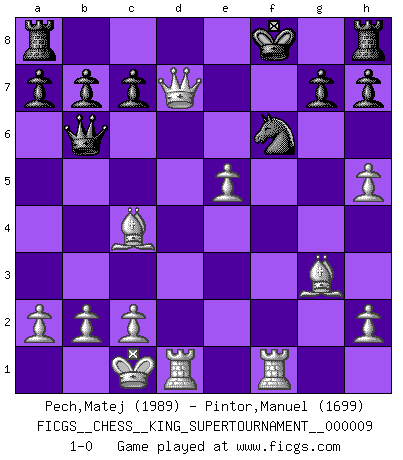 Last move : 1-0 2023 June 12 2:23:19 [Event "FICGS__CHESS__KING_SUPERTOURNAMENT__000009"] [Site "FICGS"] [Date "2023.04.23"] [Round "1"] [White "Pech,Matej"] [Black "Pintor,Manuel"] [Result "1-0"] [WhiteElo "1989"] [BlackElo "1699"] 1.e4 e5 2.f4 exf4 3.Nf3 Bc5 4.d4 Bb6 5.Bxf4 Qf6 6.Qd2 d6 7.Nc3 Bg4 8.e5 dxe5 9.Nxe5 Bh5 10.g4 Qh4+ 11.Bg3 Qe7 12.gxh5 f6 13.Nd5 Qe6 14.Bc4 Kf8 15.O-O-O fxe5 16.Rhf1+ Nf6 17.dxe5 Nbd7 18.Nxb6 Qxb6 19.Qxd7 1-0 Follow this game move after move (download)Discovered check is the dive bomber of the Chessboard. (Reuben Fine) Wenn Spassky eine Figur opfert kannst du genauso gut aufgeben. Aber wenn Tal eine Figur opfert, spiel weiter. Er könnte noch eine weitere opfern, und dann ... wer weiß? (Miguel Najdorf) Nunca antes ha habido un jugador de Ajedrez con tal conocimiento a fondo de las complejidades del juego y una inmensa voluntad absolutamente indomable de ganar. Yo pienso que Fischer es el jugador mas grande que jamás haya existido. (Lisa Lane) Les Cavaliers se révèlent fort utiles dans les positions fermées. D'habitude, les Fous sont un peu plus forts que les Cavaliers dans les positions ouvertes. Qu'on le veuille ou non, il restera toujours des exceptions ! Luck is when opportunity knocks and you answer. (Anonymous)