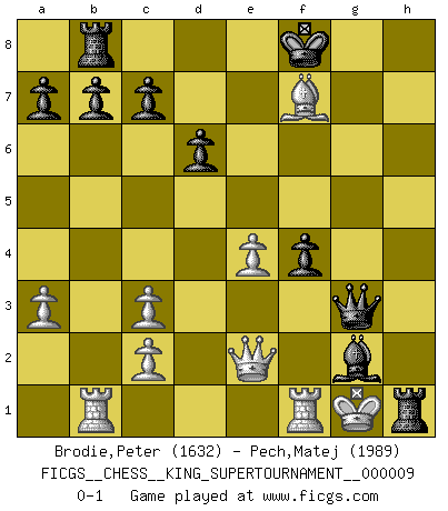 Last move : 0-1 2023 July 2 21:55:19 [Event "FICGS__CHESS__KING_SUPERTOURNAMENT__000009"] [Site "FICGS"] [Date "2023.04.23"] [Round "1"] [White "Brodie,Peter"] [Black "Pech,Matej"] [Result "0-1"] [WhiteElo "1632"] [BlackElo "1989"] 1.e4 e5 2.f4 exf4 3.Nf3 g5 4.d4 d6 5.Nc3 Bg7 6.h3 h6 7.Be2 Nc6 8.O-O Nge7 9.Bd2 Nxd4 10.Nxd4 Bxd4+ 11.Kh1 Be6 12.Bf3 h5 13.Bxf4 Bxc3 14.bxc3 gxf4 15.Rb1 Rb8 16.a3 Ng6 17.Bxh5 Qg5 18.Bxg6 Bxh3 19.Bxf7+ Kf8 20.g3 Qxg3 21.Qe2 Bg2+ 22.Kg1 Rh1+ 0-1 Follow this game move after move (download)Chess is a fighting game which is purely intellectual and includes chance. (Richard Reti) Lisa Lane, amerikanische Schachmeisterin, hatte Fischer einmal als stärksten lebenden Spieler bezeichnet. Antwort: Das ist richtig, aber Lisa Lane ist eigentlich nicht in der Lage, das zu beurteilen. (Robert James Fischer) El Rey es una pieza de pelea. ¡Usenlo!. (Wilhelm Steinitz) Un footballeur joue avec ses pieds, parfois avec sa tête. Un joueur d'échecs ne joue qu'avec sa tête. Et quand il ne joue plus, il meurt. (Jacob Murray) The intuitive mind is a sacred gift; the rational mind is a faithful servant. We have created a society that honors the servant but has forgotten the gift. (Albert Einstein)