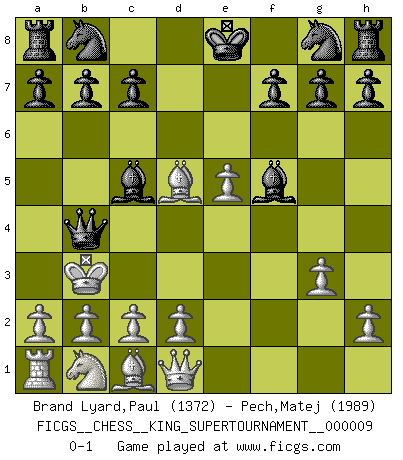 Last move : 0-1 2023 June 2 10:8:30 [Event "FICGS__CHESS__KING_SUPERTOURNAMENT__000009"] [Site "FICGS"] [Date "2023.04.23"] [Round "1"] [White "Brand Lyard,Paul"] [Black "Pech,Matej"] [Result "0-1"] [WhiteElo "1372"] [BlackElo "1989"] 1.e4 e5 2.f4 Bc5 3.fxe5 Qh4+ 4.g3 Qxe4+ 5.Be2 Qxh1 6.Bf3 Qxg1+ 7.Ke2 Qf2+ 8.Kd3 d5 9.Bxd5 Bf5+ 10.Kc3 Qd4+ 11.Kb3 Qb4+ 0-1 Follow this game move after move (download)Fischer is the strongest player in the world. In fact, the strongest player who ever lived. (Larry Evans) Wenn Du einsam bist, wenn Du Dich in der Welt wie ein Fremder fühlst, spiele Schach. Das wird Deinen Geist erheben und Dein Ratgeber im Kampf sein. (Aristoteles) ¿Porque tengo que perder ante este idiota?. (Aron Nimzovich) La vérité est comme le meilleur coup aux échecs : elle existe, mais il faut la chercher. (Arturo Perez-Reverte) All war is based on deception. (Sun Tzu)