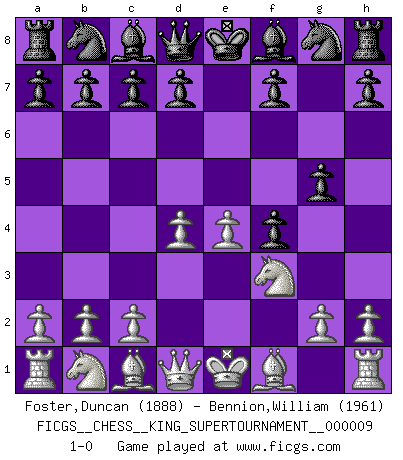Last move : 1-0 2023 May 27 1:35:6 [Event "FICGS__CHESS__KING_SUPERTOURNAMENT__000009"] [Site "FICGS"] [Date "2023.04.23"] [Round "1"] [White "Foster,Duncan"] [Black "Bennion,William"] [Result "1-0"] [WhiteElo "1888"] [BlackElo "1961"] 1.e4 e5 2.f4 exf4 3.Nf3 g5 4.d4 1-0 This chess game has been lost on time (started : 2023.04.23 2:2:48) Follow this game move after move (download)All I want to do, ever, is just play Chess. (Bobby Fischer) Es ist wirklich schade, dass so viele Schachspieler nicht auf ihr Äußeres achten! (Alexandra Kosteniuk) Cuando tengas duda... ¡juega al Ajedrez!. (Tevis) Je crois qu'il existe des manières très spécifiques de jouer efficacement contre une machine. Evidemment, nous n'avons aucune chance en technique pure, parce que l'ordinateur calcule de manière parfaite. Mais lorsque nous faisons appel à notre cerveau, en utilisant l'intuition et la compréhension, alors nous restons beaucoup plus forts. (Anatoli Karpov) 98% of all statistics are made up. (Author unknown)