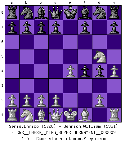 Last move : 1-0 2023 May 28 15:3:22 [Event "FICGS__CHESS__KING_SUPERTOURNAMENT__000009"] [Site "FICGS"] [Date "2023.04.23"] [Round "1"] [White "Senis,Enrico"] [Black "Bennion,William"] [Result "1-0"] [WhiteElo "1726"] [BlackElo "1961"] 1.e4 e5 2.f4 exf4 3.Nf3 g5 4.h4 g4 5.Ng5 1-0 This chess game has been lost on time (started : 2023.04.23 2:2:48) Follow this game move after move (download)You know you're going to lose. Even when I was ahead I knew I was going to lose. - On playing against Fischer. (Andrew Soltis) In Buenos Aires ist es nicht mein vorrangiges Ziel ein starkes Turnier zu organisieren, sondern ein Turnier für Gentlemen. Ich würde nie Kamsky einladen. Ich mag keine Probleme. (Miguel Najdorf) No nos podemos resistir a la fascinación de un sacrificio ya que la pasión por los sacrificios es parte de la naturaleza de un jugador de Ajedrez. (Rudolf Spielman) Les échecs sont un jeu terrible. Si vous n'avez pas le centre, votre adversaire a une position plus libre. Par contre, si vous avez le centre, alors vous avez vraiment quelque chose pour laquelle vous inquiéter ! (Siegbert Tarrasch) Wisdom doesn't necessarily come with age. Sometimes age just shows up all by itself. (Tom Wilson)