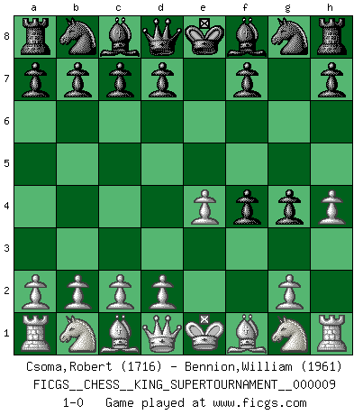 Last move : 1-0 2023 May 29 16:33:35 [Event "FICGS__CHESS__KING_SUPERTOURNAMENT__000009"] [Site "FICGS"] [Date "2023.04.23"] [Round "1"] [White "Csoma,Robert"] [Black "Bennion,William"] [Result "1-0"] [WhiteElo "1716"] [BlackElo "1961"] 1.e4 e5 2.f4 exf4 3.Nf3 g5 4.h4 g4 5.Ng1 1-0 This chess game has been lost on time (started : 2023.04.23 2:2:48) Follow this game move after move (download)I am still a victim of Chess. It has all the beauty of art and much more. It cannot be commercialized. Chess is much purer than art in its social position. (Marcel Duchamp) Ich habe kein Problem mit Frauen, sondern nur mit dem Niveau ihres Schachspiels (Judith Polgar) El juego de Fischer siempre fue nítido, racional y brillante. Uno de los mejores por siempre. (Dave Regis) Mon pion favori sur ma case favorite ! Bronstein en parlant d'un coup de pion en h5 quand il avait les Noirs. Looking at the proliferation of personal web pages on the Net, it looks like very soon everyone on Earth will have 15 megabytes of fame. (M.G. Sriram)
