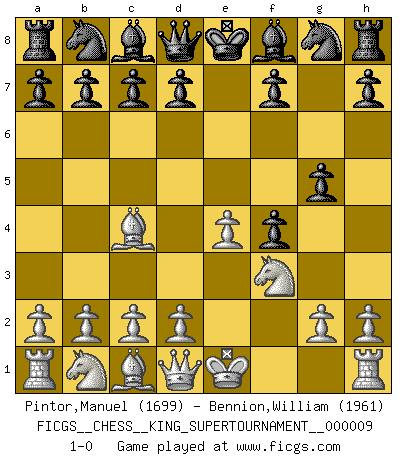 Last move : 1-0 2023 May 26 13:24:20 [Event "FICGS__CHESS__KING_SUPERTOURNAMENT__000009"] [Site "FICGS"] [Date "2023.04.23"] [Round "1"] [White "Pintor,Manuel"] [Black "Bennion,William"] [Result "1-0"] [WhiteElo "1699"] [BlackElo "1961"] 1.e4 e5 2.f4 exf4 3.Nf3 g5 4.Bc4 1-0 This chess game has been lost on time (started : 2023.04.23 2:2:48) Follow this game move after move (download)The essence of Chess is thinking about what Chess is. (David Bronstein) Besser ein falscher Plan, logisch durchgeführt, als gar kein Plan. (Viktor Kortschnoi) Dios mío, Bobby Fischer juega tan simple. (Alexei Suetin) On est toujours la mazette de quelqu'un d'autre. (Anonyme) Convictions are more dangerous enemies of truth than lies. (Friedrich Nietzsche)