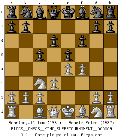 Last move : 0-1 2023 May 31 5:21:38 [Event "FICGS__CHESS__KING_SUPERTOURNAMENT__000009"] [Site "FICGS"] [Date "2023.04.23"] [Round "1"] [White "Bennion,William"] [Black "Brodie,Peter"] [Result "0-1"] [WhiteElo "1961"] [BlackElo "1632"] 1.e4 e5 2.f4 d6 3.d3 f6 4.Nc3 c5 0-1 This chess game has been lost on time (started : 2023.04.23 2:2:48) Follow this game move after move (download)What is the object of playing a gambit opening?... To acquire a reputation of being a dashing player at the cost of losing a game. (Siegbert Tarrasch) Es liegt in der Natur, vernüftig zu denken und unlogisch zu handeln. (Anatole France) No hay precio que no valga la pena por la cabellera del Rey enemigo. (Koblentz) Les pièces de l'échiquier étaient impitoyables. Elles le retenaient, elles l'absorbaient. Il y avait de l'horreur en cela, mais aussi une harmonie unique. Car, qu'y a-t-il dans le monde, à part les échecs ? (V. Nabokov) The ultimate in disposing one's troops is to be without ascertainable shape. Then the most penetrating spies cannot pry in nor can the wise lay plans against you. (Sun Tzu)