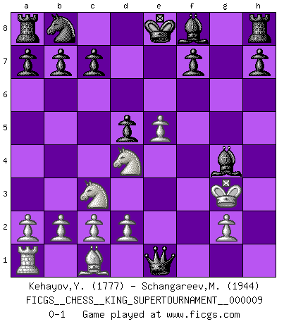 Last move : 0-1 2023 April 28 18:5:47 [Event "FICGS__CHESS__KING_SUPERTOURNAMENT__000009"] [Site "FICGS"] [Date "2023.04.23"] [Round "1"] [White "Kehayov,Yulian"] [Black "Schangareev,Mirzian"] [Result "0-1"] [WhiteElo "1777"] [BlackElo "1944"] 1.e4 e5 2.f4 exf4 3.Nf3 Nf6 4.e5 Nh5 5.Be2 g5 6.Nc3 d5 7.Nd4 g4 8.Bxg4 Qh4+ 9.Kf1 Bxg4 10.Qe1 Ng3+ 11.hxg3 Qxh1+ 12.Kf2 fxg3+ 13.Kxg3 Qxe1+ 0-1 Follow this game move after move (download)First-class players lose to second class players because second-class players sometimes play a first-class game. (Tarrasch) Garry Kasparov war erst in der Großmeister-Organisation GMA, dann in der Profischach-Vereinigung PCA, zum Schluss kehrte er wieder in den Schoß der FIDE zurück. Aber gut, manche Leute sind flexibel (Viswanathan Anand) Ciertamente, de todas la drogas del mundo, el Ajedrez debe ser el mas placentero permamentemente. (Assiac) Un journaliste : 'Vous préférez avoir une dame de plus sur l'échiquier ou au lit ?' Boris Spassky : 'Ca dépend de la position.' Somehow our devils are never quite what we expect when we meet them face to face. (Nelson DeMille)