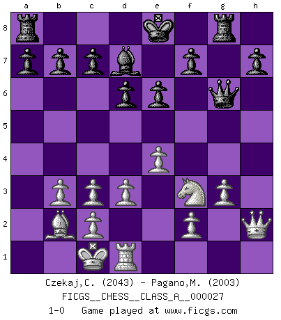Last move : 1-0 2007 October 16 14:15:40 [Event "FICGS__CHESS__CLASS_A__000027"] [Site "FICGS"] [Date "2007.08.29"] [Round "1"] [White "Czekaj,Christophe"] [Black "Pagano,Marcelo"] [Result "1-0"] [WhiteElo "2043"] [BlackElo "2003"] 1.Nc3 g6 2.h4 Nf6 3.e4 d6 4.h5 Nxh5 5.Rxh5 gxh5 6.Qxh5 Bg7 7.Bc4 e6 8.Nf3 Nc6 9.d3 Bxc3+ 10.bxc3 Qf6 11.Bb2 Qg6 12.Qh2 Rg8 13.g3 Bd7 14.O-O-O Na5 15.Bb3 Nxb3+ 16.axb3 1-0 Comment by player 2 : Marcelo Pagano : I wish to resign all my games in FICGS because I'm not satisfied with the level chess that i've have been played. So i'll wait you next move for resign! Kind regards! Dunst (Sleipner, Heinrichsen) Opening Queenside Castling by player White (move 14) Player White won this chess game. Follow this game move after move (download)When you are lonely, when you feel yourself an alien in the world, play Chess. This will raise your spirits and be your counselor in war. (Aristotle) Dein Körper muss in Topform sein. Dein Schach verfällt, wenn dein Körper verfällt. Der Körper kann nicht vom Geist getrennt werden. (Robert James Fischer) Tu no necesitas jugar muy bien, únicamente ayudar a tu oponenet a que juegue muy mal. (Genrikh Chepukaitis) Les Echecs mettent en conflit, non pas deux intelligences, mais deux volontés. (Lasker) Vladimir Ras-Putin is still alive... He is also a good actor, I saw him in the Lord of the Rings. (Rodolfo d'Ettorre)