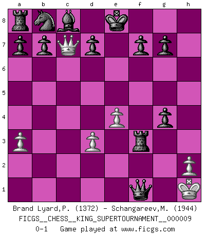 Last move : 0-1 2023 April 24 19:37:17 [Event "FICGS__CHESS__KING_SUPERTOURNAMENT__000009"] [Site "FICGS"] [Date "2023.04.23"] [Round "1"] [White "Brand Lyard,Paul"] [Black "Schangareev,Mirzian"] [Result "0-1"] [WhiteElo "1372"] [BlackElo "1944"] 1.e4 e5 2.f4 exf4 3.d3 Qh4+ 4.g3 fxg3 5.Kd2 g2 6.Bxg2 Qg5+ 7.Ke1 Qxg2 8.Qf3 Qxc2 9.Na3 Bxa3 10.bxa3 Qc3+ 11.Bd2 Qxa1+ 12.Kf2 Qxa2 13.Nh3 Qxd2+ 14.Kg3 h5 15.Ng5 Qxg5+ 16.Kf2 Nf6 17.Rg1 Ng4+ 18.Rxg4 hxg4 19.Qg3 Rh3 20.Qxc7 Rf3+ 21.Kg2 Qd2+ 22.Kg1 Qf2+ 23.Kh1 Qf1+ 0-1 Follow this game move after move (download)Fischer, who may or may not be mad as a hatter, has every right to be horrified. (Jeremy Silman) Darum geht es im Schach. Einen Tag gibst du deinem Gegner eine Lektion, am nächsten Tag gibt er dir eine. (Robert James Fischer) El Ajedrez detiene a su maestro dentro de sus propios vínculos, encadenando la mente y el cerebro, por lo que la libertad interior del mas fuerte debe sufrir. (Albert Einstein) Nous sommes les pions de la mystérieuse partie d'Echecs jouée par Dieu. Il nous déplace, nous arrête, nous pousse encore, puis nous lance un à un dans la boîte du Néant. Epitaphe sur la tombe de David Janowsky (1868-1927). If you have any trouble condescending, find a Unix user to show you how it's done. (Scott Adams)